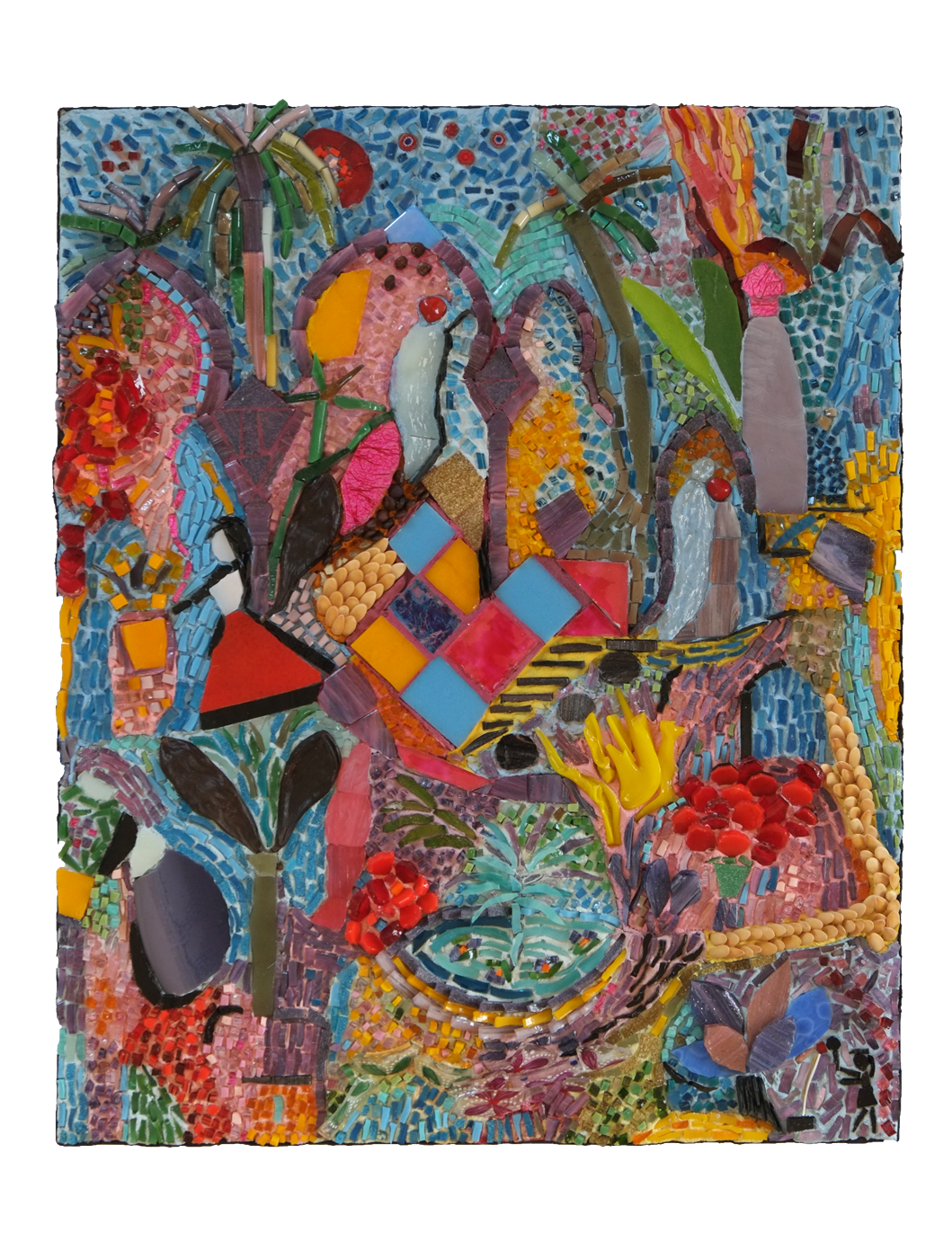 Mais revenons au tableau de Jacqueline. Il faut dire que je me ne me suis pas contentée d'une longue observation du tableau (sujet à interpréter) : construction, couleur lumière... j'ai aussi relu son très beau livre relatant son enfance insouciante en Tunisie, "Le Jokari", en en relevant toutes les expressions et toutes les images qu'elle utilise, les noms des fleurs, fruits, les personnages, les émotions... Les souvenirs de ces paradis perdus (Tunisie et enfance) imprègnent nombre de ses tableaux en particulier celui que j'avais à interpréter. J'ai utilisé tout ce "matériau" mémoriel et essayé de le transcrire en matériaux concrets. Il fallait recoller les morceaux de son histoire, percer l’énigme de sa mémoire pour en reconstituer le puzzle. C'est ainsi que tous ces souvenirs sont devenus des tesselles, différents éléments à assembler, à encastrer, à jointoyer, à unifier. Évidemment, l'adamento, le sujet du tableau, la forme, l'âme ne pouvait pas être modifiés. Les couleurs non plus. Pour ressusciter ces souvenirs, j'ai beaucoup utilisé le verre (en plaque smalts de Venise, verre Albertini, pâtes de verre, chute de verre, millefiori et même un verre à thé brisé) souvent travaillé en pointillisme afin d'accrocher la lumière et d'essayer de restituer celle qui nimbe les tableaux et le livre de Jacqueline. Les personnages par contre sont traités par la technique dite du "sur-mesure" (vitrail). Différentes graine de fruits mentionnés dans le livre sont devenues palmier, pavement, tête de femme. Plusieurs verres rouges ont été utilisés pour interpréter l'efflorescence qui explose littéralement dans le tableau et le livre, verre parfois aussi coupant et blessant que peuvent être les souvenirs. Et en guise de signature, cette fragile et petite silhouette de fillette insouciante jouant au jokari, en bas à droite de la mosaïque que j'ai rajoutée sans j'espère, trahir l'identité et l'âme du tableau mais qui est là, présente (qui sait ?) pour l'éternité.